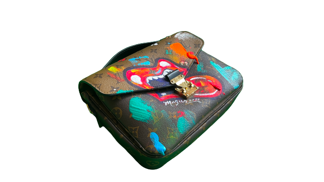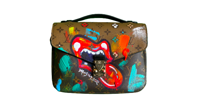 This is a one of a kind Louis Vuitton handbag with an orginak mouth and tongue logo painted on it by Ruby Mazur  - The creator of the Mouth & Tongue Logo designed for the Tumbling Dice Record Sleeve in 1971.